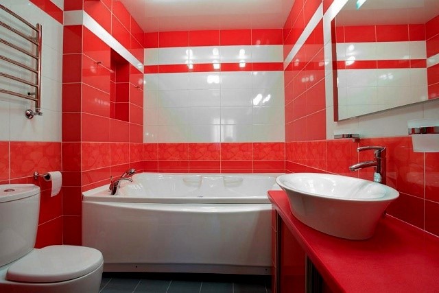 Если вам позволяет пространство, то вам повезло вдвойне, ведь тогда можно использовать красный цвет. Желательно разбавить его каким-нибудь еще, например, белым. Здесь, как и во многих других ванных, использовано несколько видов красной плитки и небольшие вкрапления из белой. На потолке использована натяжная конструкция с глянцевой поверхностью.