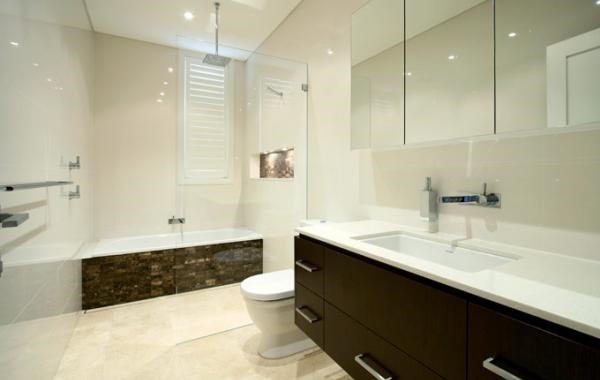 Здесь уже куда больше места, чтобы развернуться или придумать несколько идей для дизайна. Современный стиль в сочетании с минимализмом очень удачно смотрится в любой ванной комнате, независимо от ее размеров. Если у вас нет никакого желания играть с цветами, то оптимальным решением станет белый цвет с небольшими примесями и темными элементами.